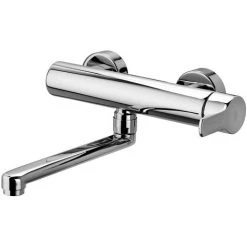 Mitigeur d’évier élégant pour installation murale avec bec orientable et corps de mitigeur rond.