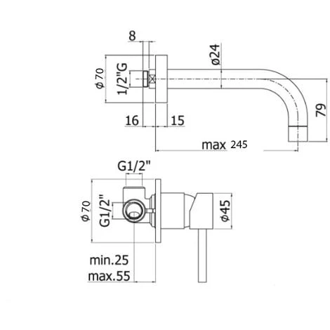 Type : mitigeur lavabo à encastrer avec bec mural longueur 245 mm, aérateur et plaque diamètre 70 mm ;