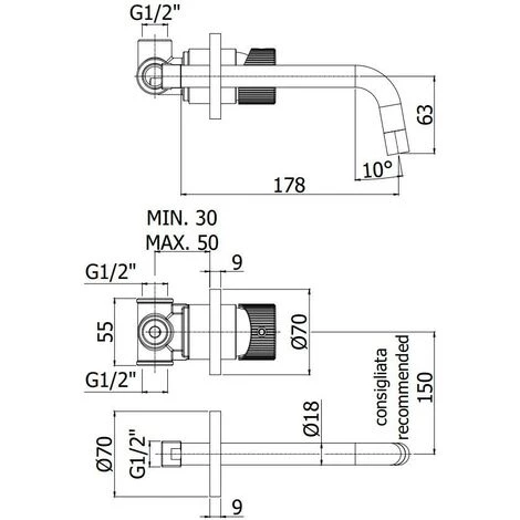 Mitigeur lavabo mural avec plaques Ø70 mm et bec long 178/248 mm |Paffoni Rubinetteria JO JO006-JO007