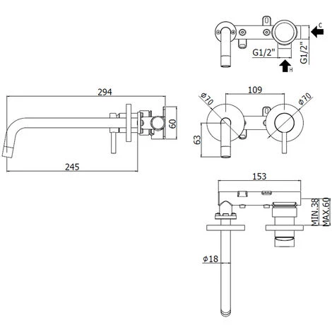 Type : mitigeur de lavabo à encastrer avec bec mural de 245 mm ;